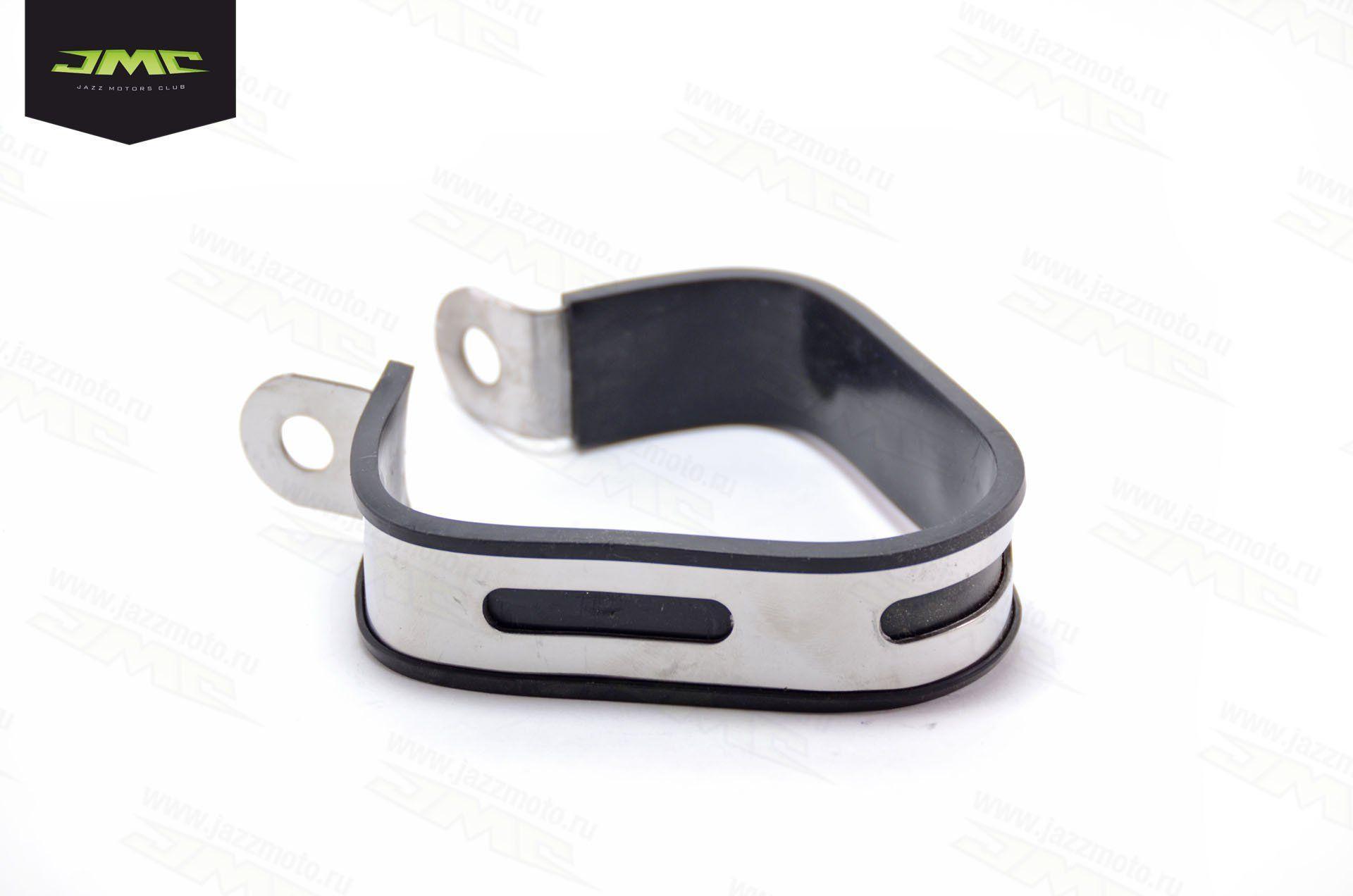 Хомут глушителя треугольной формы с резинкой. Прочно фиксирует положение глушителя.  Материал – сталь. Толщина хомута – 24 мм. Диаметр крепления – 8,6 мм.